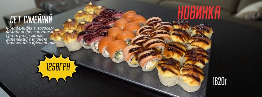 Філадельфія з лососем, Філадельфія з тунцем, Гриль рол з манго, Запечений з куркою, Запечений з креветкою